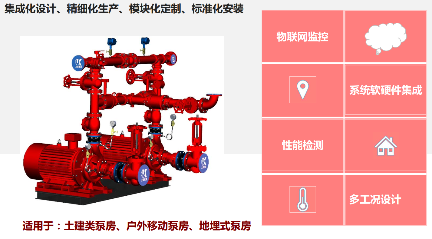 消防物聯(lián)網(wǎng)供水成套機(jī)組,控制系統(tǒng)集雙電源及自動切換、水泵啟停控制、機(jī)械應(yīng)急啟動裝置、自動低頻巡檢系統(tǒng)、自動工頻巡檢系統(tǒng)、自動末端試驗、遠(yuǎn)程物聯(lián)網(wǎng)消防等功能于一體的控制柜, 在不影響、不改變火災(zāi)自動報警系統(tǒng) 正常功能的基礎(chǔ)上生成物聯(lián)網(wǎng)消防系統(tǒng), 防護(hù)等級標(biāo)配為IP55。